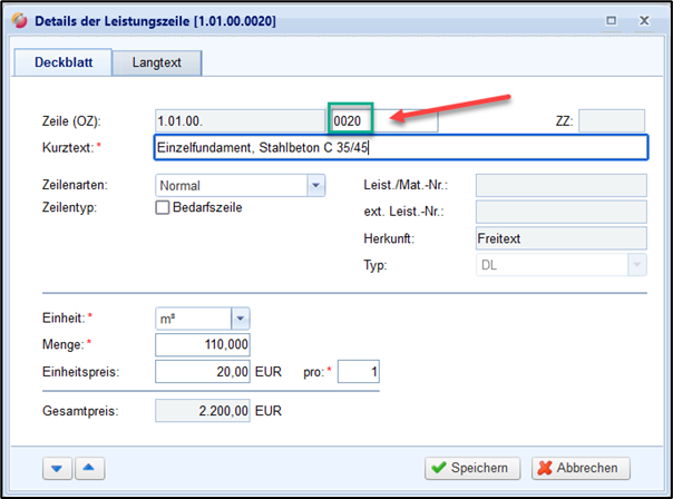 Bei manueller OZ Nummerierung kann die OZ von Titeln und LZ manuell angepasst werden. Öffnen Sie dafür die Leistungszeile mit einem Doppelklick: