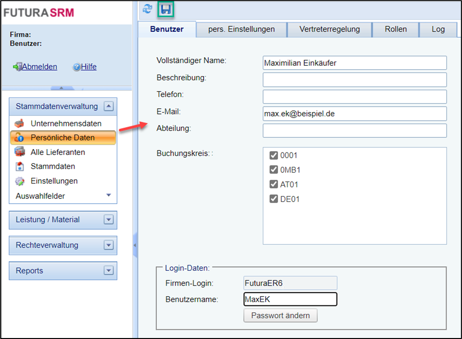 Im Menü Persönliche Daten werden die Benutzerdaten des Users angezeigt, mit dem Sie sich angemeldet haben.