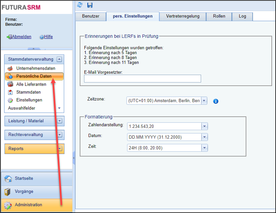 Formatierung (Zahlendarstellung, Datum und Zeit): Diese persönlichen Einstellungen steuern in Ihrem Zugang die Formatierung (Datum, Zeit, Zahlendarstellung) bei der Anzeige in der GUI aber auch welche Formatierung beim Export der Excel und PDF-Dateien (z.B. LV, LERF) und beim Import von LVs (Excel) relevant ist.