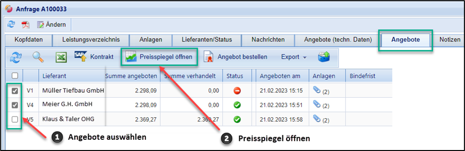 Nach Ablauf der Abgabefrist und der Angebotsöffnung können Sie die Angebote im Preisspiegel öffnen und auswerten. Markieren Sie in der Angebotsliste die gewünschten Angebote und klicken Sie auf den Button „Preisspiegel öffnen“: