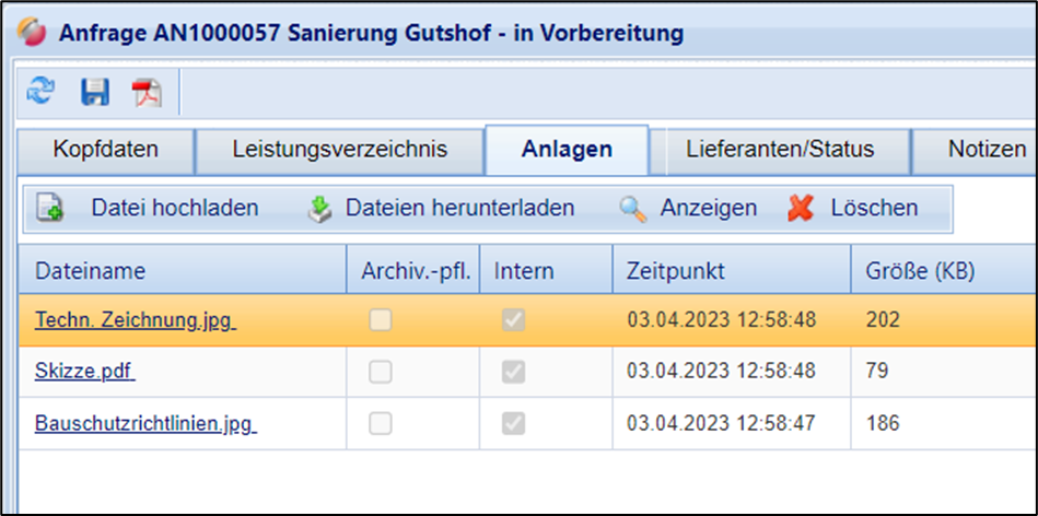 Öffnen Sie die Anfrage und wechseln Sie auf den Reiter Anlagen.