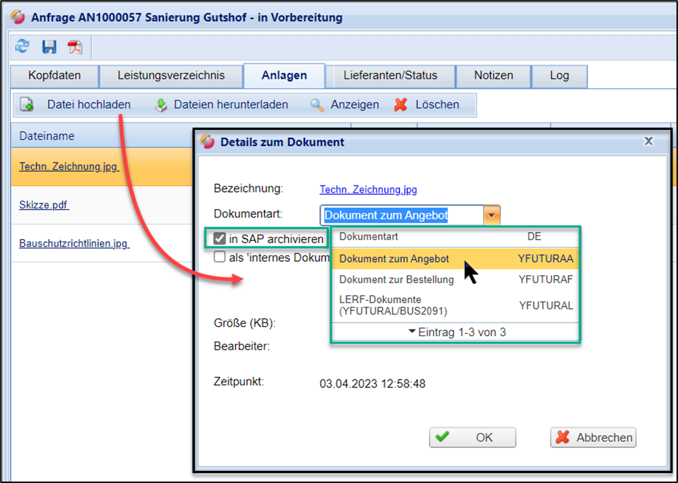 Sollte Ihre Organisationseinheit mit SAP-Anbindung arbeiten und ist für Ihren Prozess die Archivierung von Dokumenten eingerichtet, dann können Sie diese zusätzlich nach SAP übertragen. Hierfür ist es erforderlich, dass Dokumentarten in SAP eingerichtet und analog in FUTURA Engineering gepflegt sind. Die Dokumentarten sind bei der Übertragung die für SAP nötige Identifizierung, damit die hinterlegten Dokumente im entsprechenden Beleg (BANF, Anfrage, Bestellung) zugeordnet und archiviert werden.