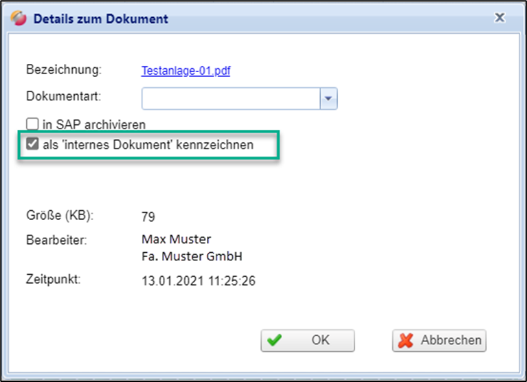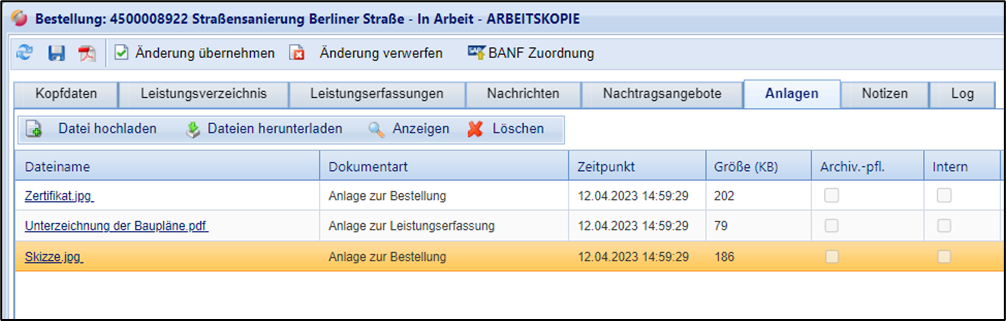 Sie können Anlagen auch als interne Dokumente deklarieren. Diese sind dann nur innerhalb Ihrer Einkaufsorganisation auf Auftraggeberseite sichtbar. Anlagen, die nicht als „internes Dokument“ gekennzeichnet werden, werden erst nach Start oder Freigabe des jeweiligen Vorgangs dem Lieferanten angezeigt.