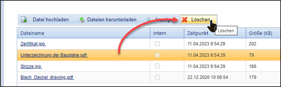 Markieren sie eine Datei in der Liste und klicken Sie auf den „X“-Button zum Löschen. Die Datei wird aus der Anfrage entfernt.