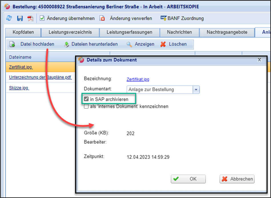 Sollte Ihre Organisationseinheit mit SAP-Anbindung arbeiten und ist für Ihren Prozess die Archivierung von Dokumenten eingerichtet, dann können Sie diese zusätzlich nach SAP übertragen. Hierfür ist es erforderlich, dass Dokumentarten in SAP eingerichtet und analog in FUTURA Engineering gepflegt sind. Die Dokumentarten sind bei der Übertragung die für SAP nötige Identifizierung, damit die hinterlegten Dokumente im entsprechenden Beleg (BANF, Anfrage, Bestellung) zugeordnet und archiviert werden.