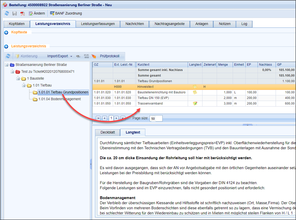 Auf dem Registerreiter Leistungsverzeichnis wird das Leistungsverzeichnis (LV) der Bestellung angezeigt.