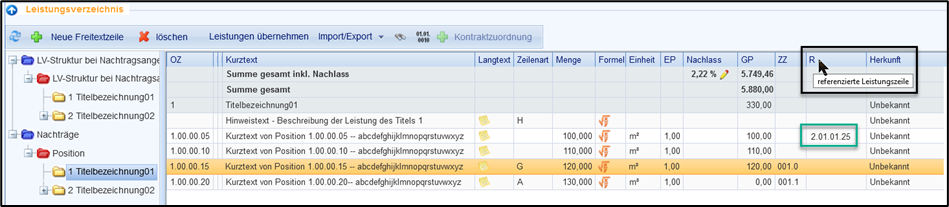 In der Spalte "Referenz zu" wird bei Nachtragspositionen die Leistungsnummer der ursprünglich beauftragten Leistung angezeigt. Handelt es sich beispielsweise um eine Mengenmehrung oder -minderung, so wird die Nachtragszeile extra mit der Mehrung/Minderung ausgewiesen. Im folgenden Beispiel hat der Auftraggeber einen Nachtrag mit zwei Nachtragszeilen übermittelt. Beide Nachtragzeilen referenzieren auf beauftragte Leistungen, deren Leistungsnummer im Feld „Referenz zu“ dargestellt wird.
