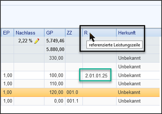 Der Spalte „Herkunft“ können Sie entnehmen, welchen Ursprung die entsprechende Leistungszeile hat: