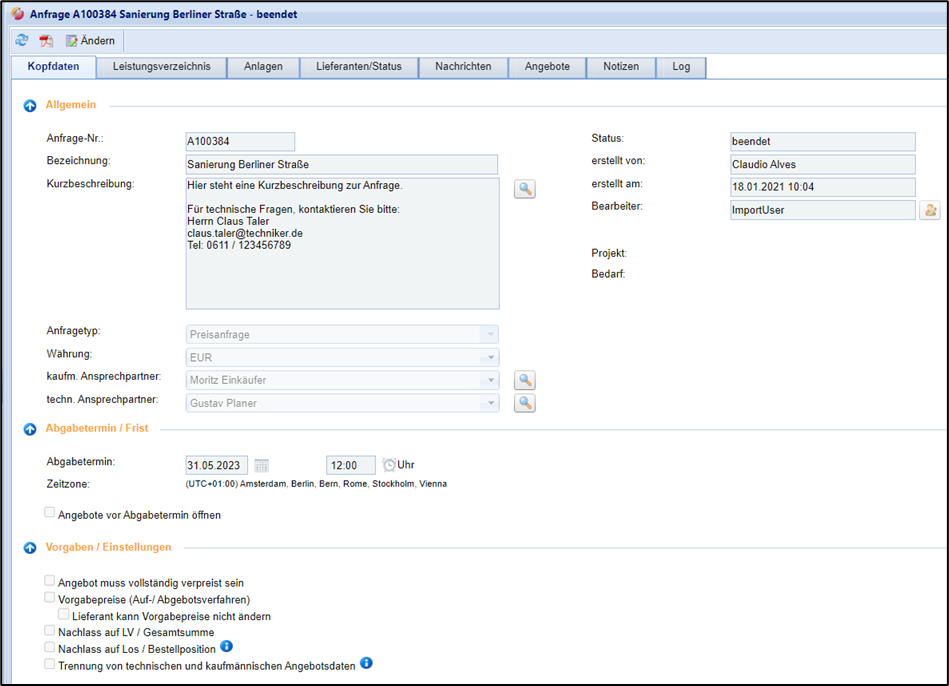 Abgabetermin | Datum (TT.MM.JJJJ) und Uhrzeit (HH:MM). Nach dem Erreichen des Abgabetermins endet die Anfrage, die Anfrage wechselt in den Status „Beendet“. Danach ist eine Angebotsabgabe nicht mehr möglich. |