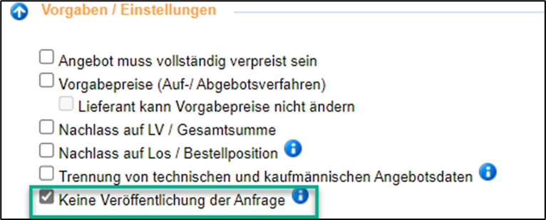 Sofern die Option aktiviert ist, erfolgt keine offizielle Ausschreibung über die Plattform FUTURA. Die ausgewählten Lieferanten sehen die Anfrage nicht in ihrem Zugang, außerdem erhalten Sie keine Benachrichtigungen via E-Mail zu dieser Anfrage. Die Option sollten Sie nur dann aktivieren, wenn bereits eine Ausschreibung außerhalb des Systems FUTURA durchgeführt wurde und Angebote hierzu vorliegen. Die Angebote können Sie dann importieren oder alternativ im Preisspiegel pflegen.