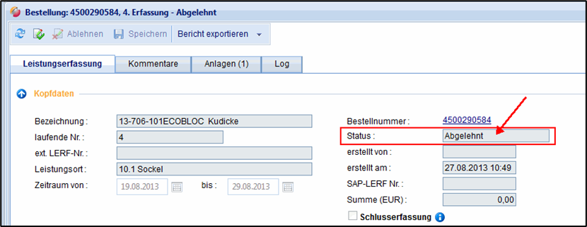 Abgelehnt | Die Leistungserfassung wurde abgelehnt. In diesem Fall geht die Erfassung mit den korrigierten Mengen zurück an den Lieferant. Dieser kann die geprüfte Erfassung überarbeiten und erneut übermitteln. |