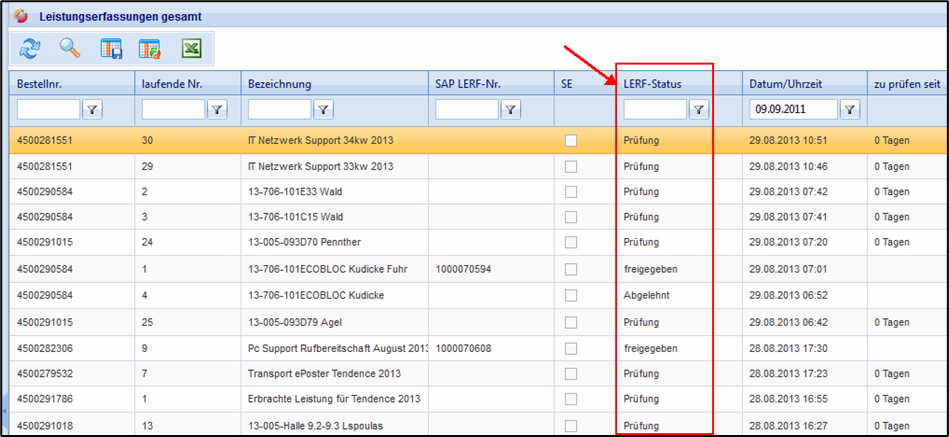 Den Status finden Sie in der Leistungserfassung auf den „Kopfdaten“ und in den Übersichtslisten zu Leistungserfassungen: