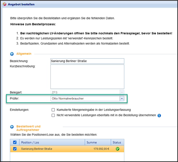 Prüfer im Dialogfenster für die Bestellauslösung zuordnen