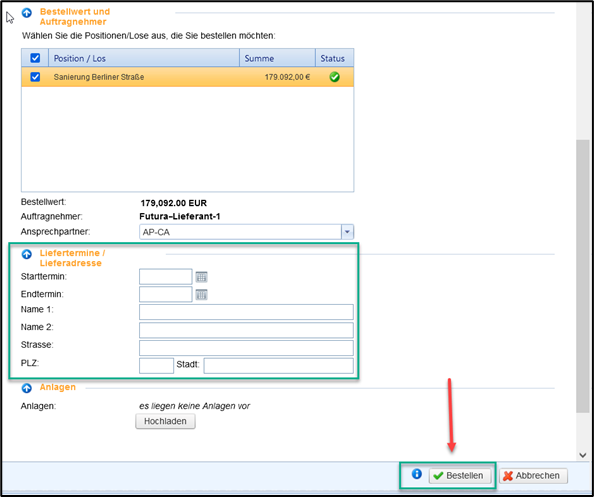 Im unteren Bereich können Sie optional Liefertermine und Lieferadressen pflegen. Mit dem Button „Bestellen“ wird das Angebot in eine Bestellung überführt.