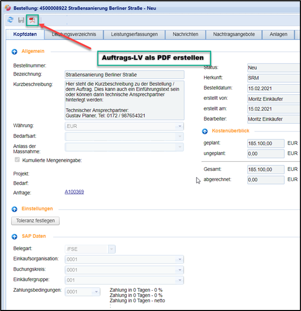 Die Bestellung wird angelegt und erhält den Status „in Vorbereitung“. Mit dem PDF-Button generieren Sie das Auftrags-LV und können sich diesen herunterladen.