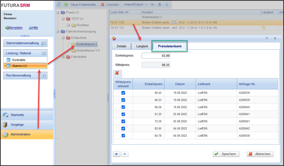 In der Ausschreibung erzielte Angebotspreise, können im Stamm-LV gespeichert und dort verwaltet werden. Es lassen sich beliebig viele Angebotspreise verwalten. Aus den archivierten Angebotspreisen zu einer Stamm-Leistungszeile kann daraufhin automatisiert ein Mittelpreis berechnet werden. In den Details einer Leistungszeile des Stammleistungsverzeichnisses haben Sie dann die Möglichkeit eine Preisdatenbank mit angebotenen Einheitspreisen aus den Anfragen einzusehen. Bestimmen Sie selbst, welche Preise für die Berechnung des Mittelpreises herangezogen werden. Die Mittelpreise können dann für die Kalkulation von zukünftigen Baumaßnahmen im Bedarf oder in der Anfrage verwendet werden. Voraussetzung hierbei ist, dass Sie Leistungszeilen aus dem Stamm-LV in Ihrer Anfrage verwenden. Diese sind grundsätzlich immer mit festen Leistungsnummern angelegt. Erstellen Sie in einer Anfrage ein LV mit Leistungszeilen aus dem Stamm-LV, so können die Angebotspreise der Lieferanten in das Stamm-LV zurück gespeichert werden.