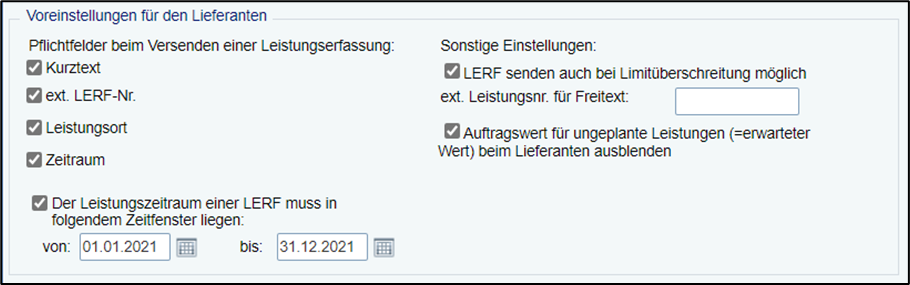 Zum Abschluss einer Buchungsperiode (z.B. dem Jahreswechsel) ist es in der Regel so, dass Leistungen, welche in dieser Buchungsperiode erbracht wurden, innerhalb eines festgelegten Zeitfensters abgerechnet sein müssen. Gleichermaßen gilt, dass Leistungen, die in der nachfolgenden Buchungsperiode erbracht wurden, zu diesem Zeitpunkt noch nicht abgerechnet werden dürfen. Für diesen Fall bietet diese Option, zentral einen erlaubten Leistungszeitraum festzulegen. In diesem Fall muss der Leistungszeitraum einer Leistungserfassung innerhalb des erlaubten Zeitraums liegen, ansonsten kann der Lieferant seine Leistungserfassung nicht absenden.