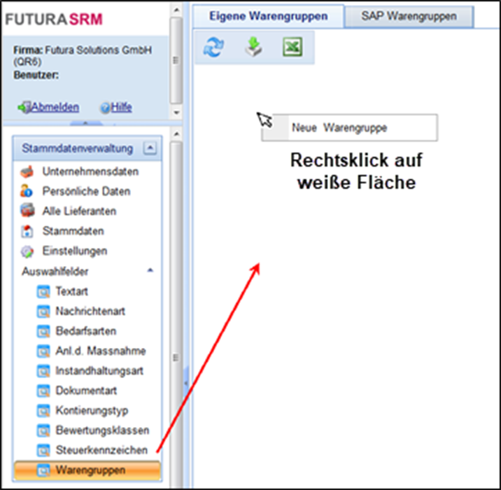 Um eigene Unternehmens-Warengruppen anzulegen, rufen Sie unter „Auswahlfelder“ den Bereich „Warengruppen“ auf, klicken mit der rechten Maustaste auf die weiße Fläche und wählen „Neue Warengruppe“: