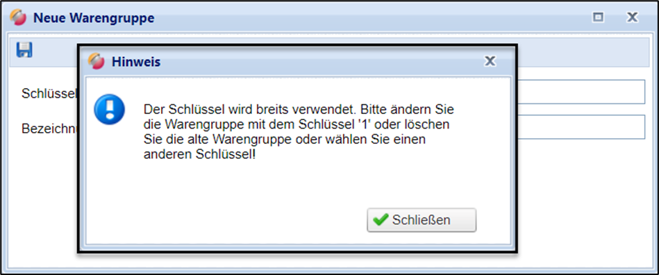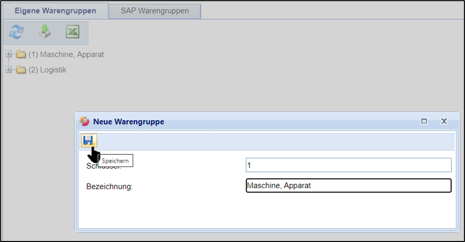 Tragen Sie eine Schlüsselbezeichnung und eine Bezeichnung für die Warengruppe ein und speichern Sie mit dem Disketten-Icon: