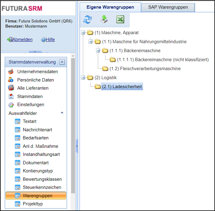Im Bereich „Warengruppen“ können Sie eigene Unternehmens-Warengruppen anlegen. Diese werden dann innerhalb Ihrer Organisationseinheit auch für andere User verfügbar sein. Die Warengruppen können ab der Erstellung den Stammsätzen der Lieferanten zugeordnet werden.