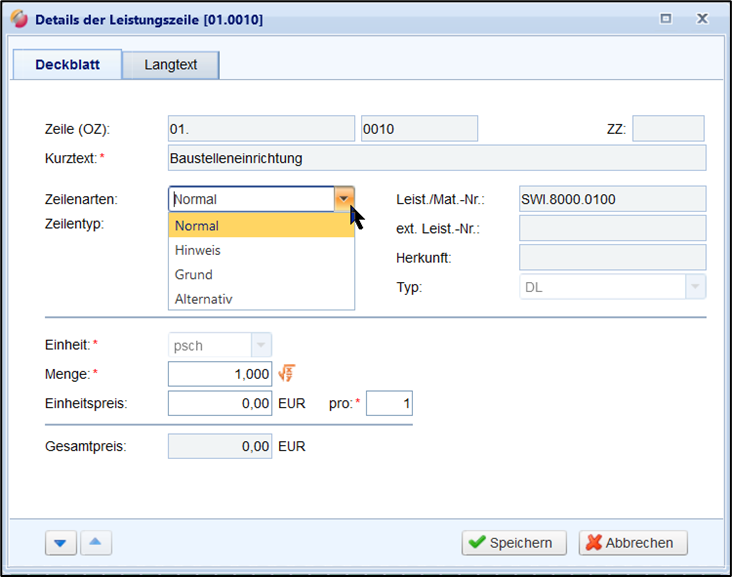 Detailfenster einer Leistungszeile