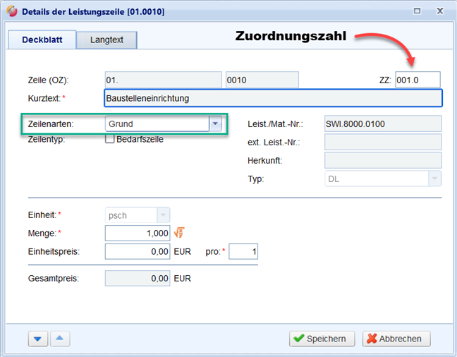 Beim Anlegen einer Grundzeile in einem LV wird automatisch die Zuordnungszahl vom System vergeben, beginnend mit der ersten frei verfügbaren Zuordnungszahl 001.0, 002.0, 003.0 usw.