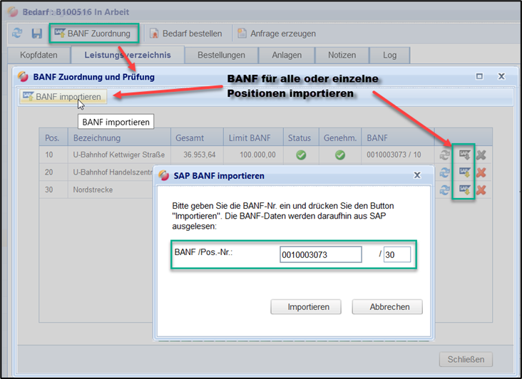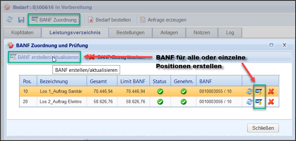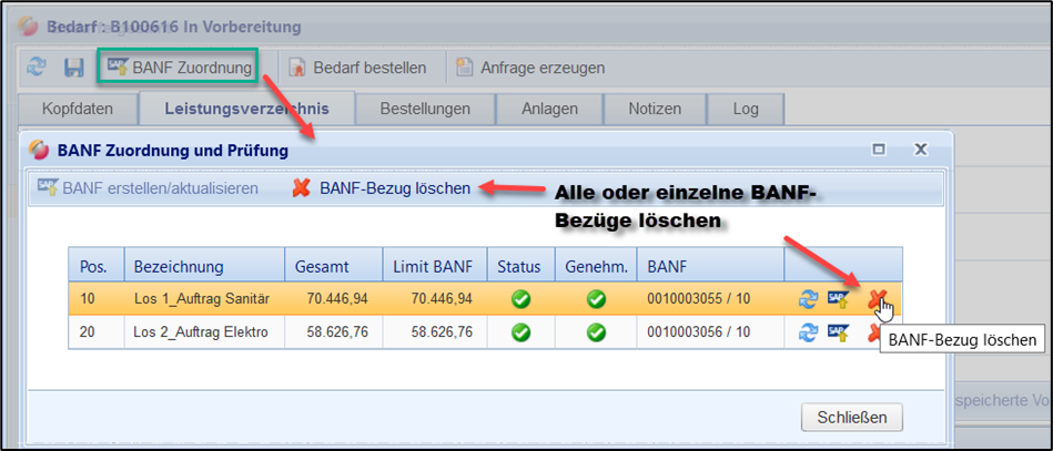 Der Bezug zur BANF kann mit dem “X”-Button entweder in allen oder aus einzelnen Positionen wieder gelöscht werden: