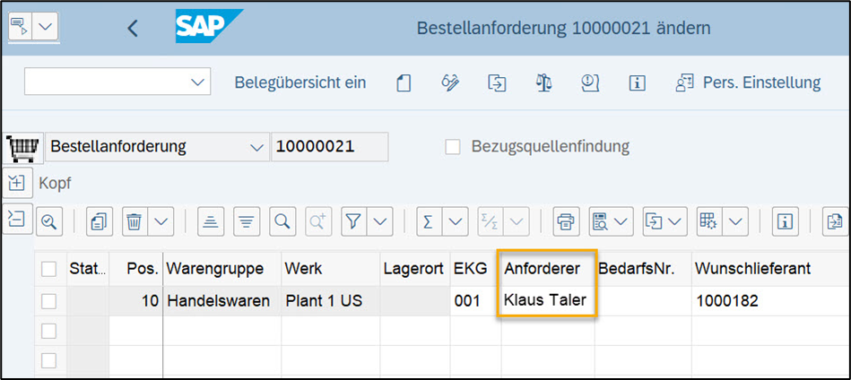 Auch das Feld für den „Anforderer“ wird in SAP mit Ihrem Benutzernamen befüllt. Damit können Sie im SAP-System feststellen, von welchen Mitarbeitern Ihrer Organisation die entsprechende BANF generiert wurde. Diese Information wird bei jeder Erstellung einer BANF berücksichtigt.