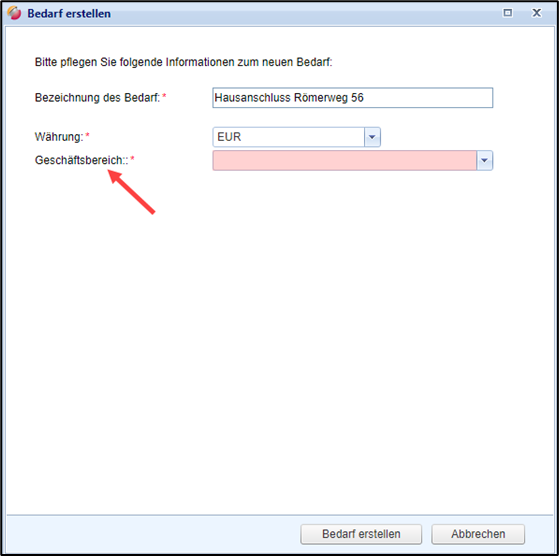 Beim Anlegen eines Bedarfs oder Anfrage haben Sie nun die Möglichkeit eine Organisationseinheit auszuwählen. Die Bezeichnung des Felds wird aus der Administration übernommen.