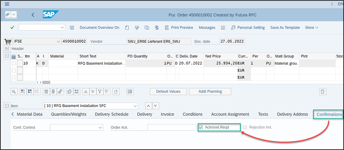 If you would like a confirmation by the supplier for an order, select the option "Acknowl.Reqd" on at least one order item . The order is then considered to be subject to confirmation.