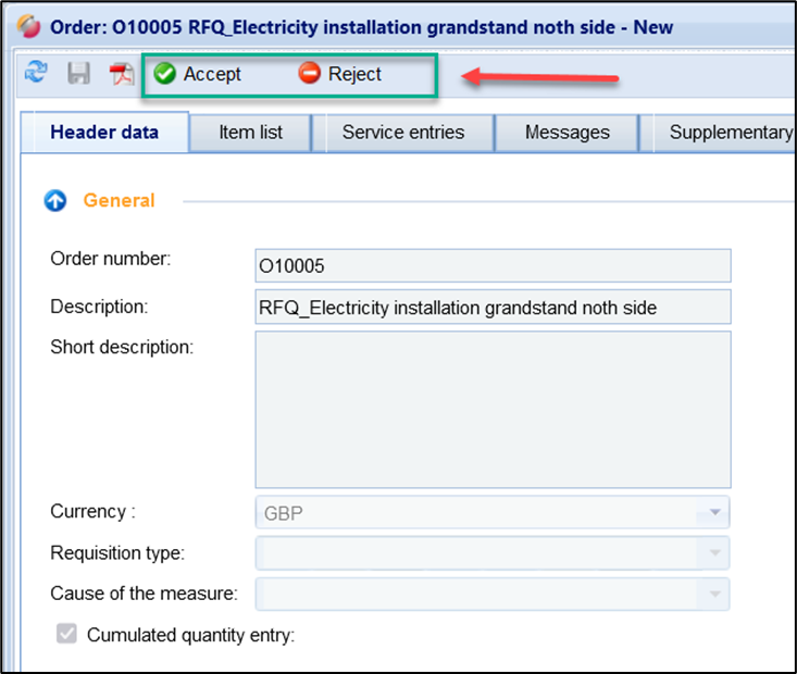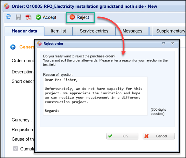 If the supplier clicks on the "Reject" button, a window opens in which the supplier must enter a reason for rejection. The customer is informed by e-mail about the rejection, the reason for rejection is displayed in the "header data" of the order: