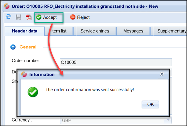 If the supplier clicks on the "Accept" button, the order is activated, and the supplier can start processing. A subsequent rejection is no longer possible in this case. The approver will be informed by e-mail about the order confirmation. Furthermore, the acceptance is logged in the log.