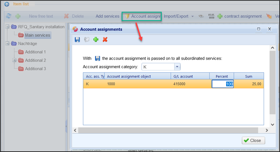 It is possible that the account assignment is defined as a lump sum for all services of a folder (order item, title, subtitles) and thus inherited on the subordinate service lines. To do this, the destination folder must first be selected. The button for account assignment then becomes active. When creating requisitions, in the Items list tab, the button for account assignment is displayed in the button bar: