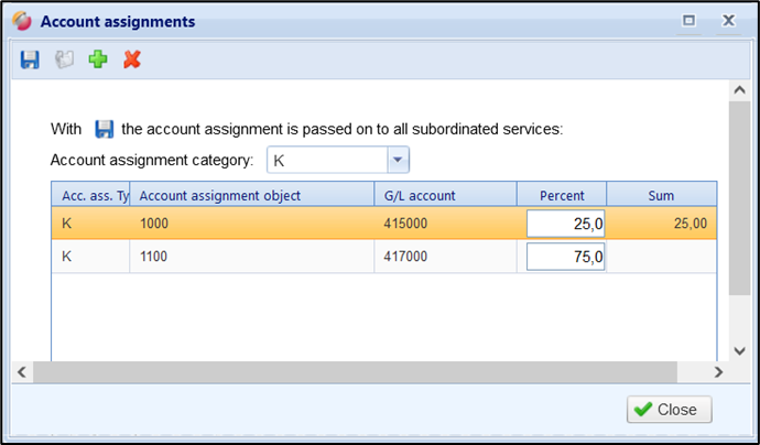 Only lines with a total price can be considered for account assignment. Service lines with an unit price value of 0.00 are not included in the distribution of the percentage calculation. The same applies to service lines that are created as the following item types: