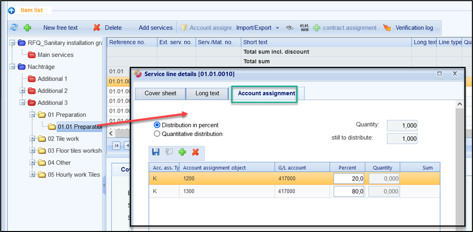 Account assignment at folder level can be made by clicking on an order item (red folder) or a title (yellow folder) in the "Items list" tab. The button for account assignment is then activated. The button for account assignment can be selected in each status of the order in order to be able to view the account assignment. However, the fields can only be edited if the order is in the "in preparation" status or in the working copy (change mode).