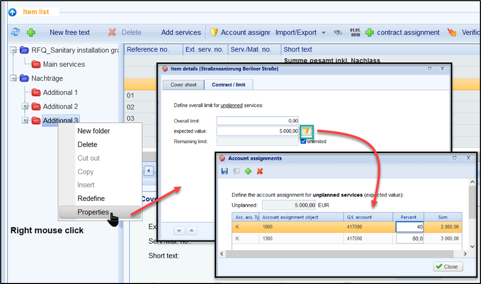 You can maintain an account assignment for unplanned costs in the properties of the order item under the tab "Contract/Limit" tab and by clicking on the button . With the button you can create the account assignment: