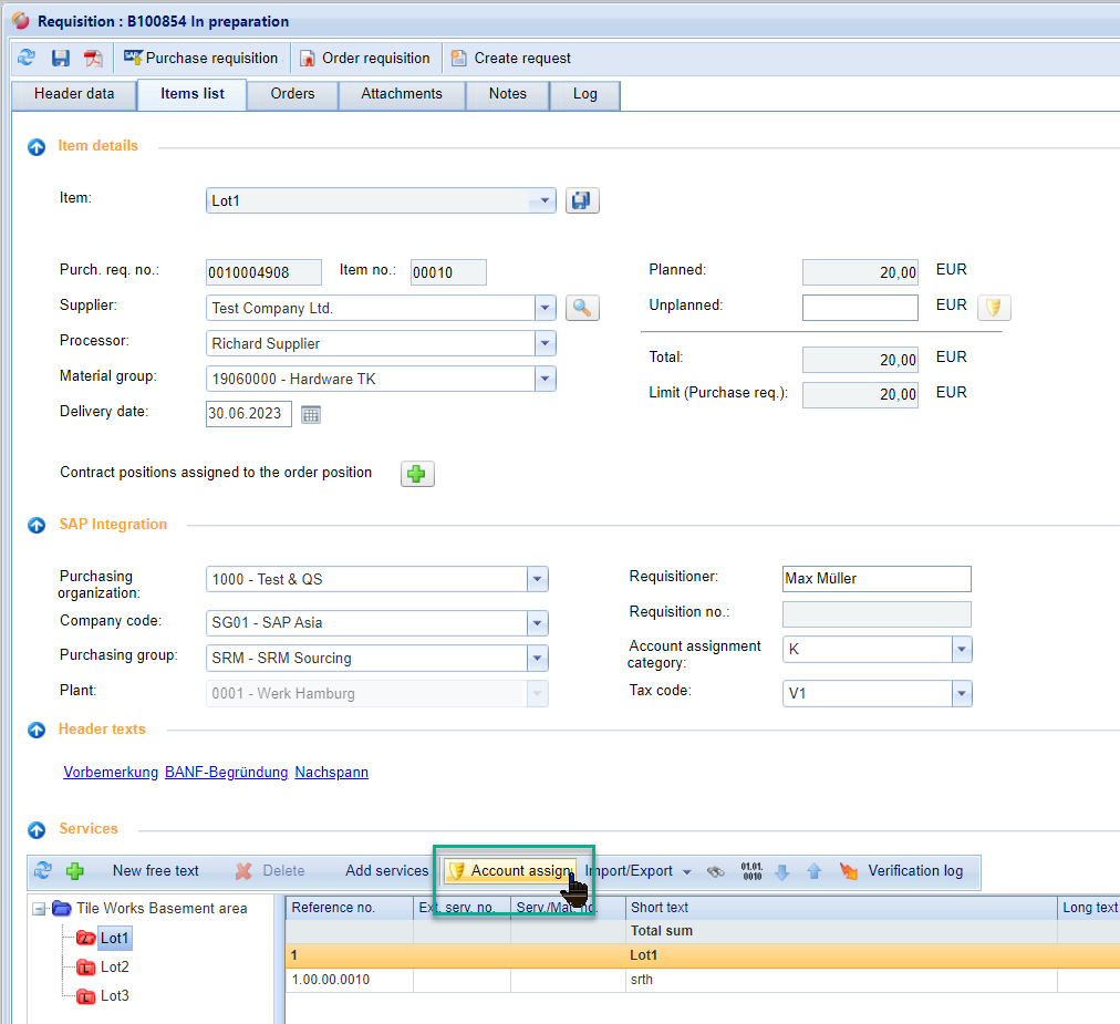 Account assignment in a requisition