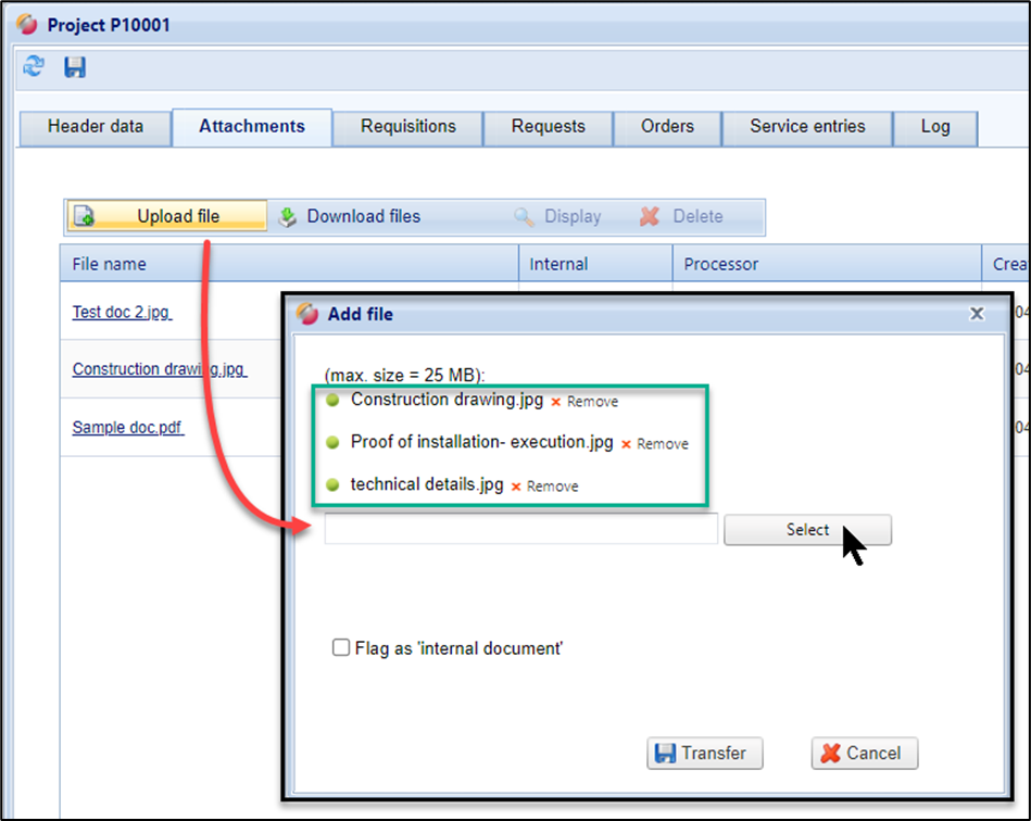 With the help of the button "Transfer" the selected files are uploaded and displayed in the list.