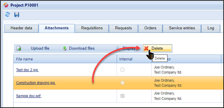 In the tab "Attachments", project-relevant documents can be added as attachments. These are inherited for all activities assigned to this project (requisitions -> requests -> Orders). In the respective transactions linked to the project, further attachments can be added analogously afterwards.