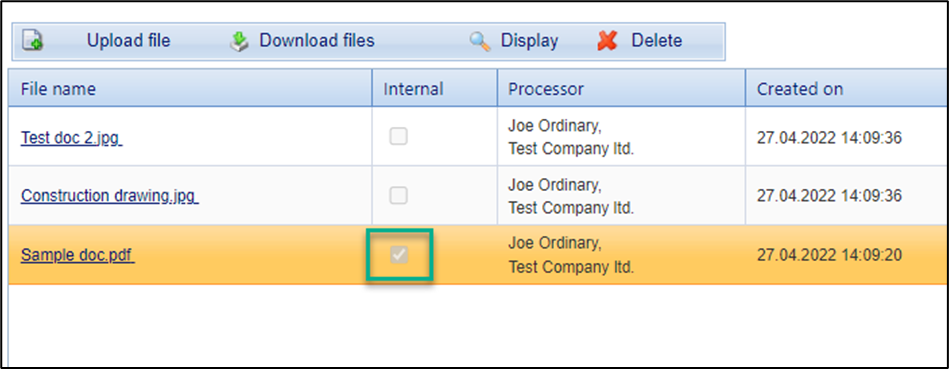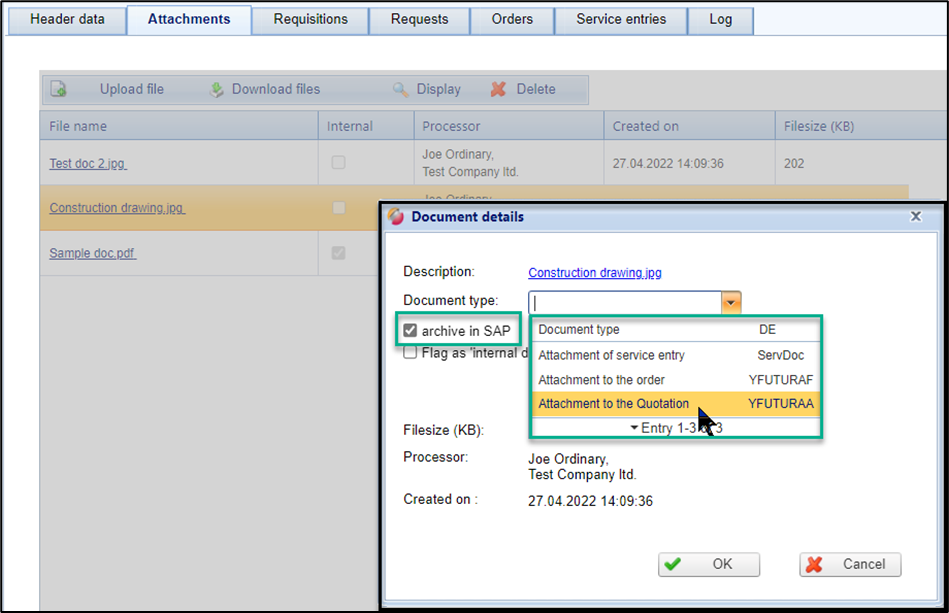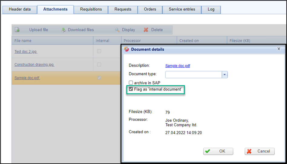 You can also declare attachments as internal documents. These are then only visible within your purchasing organization on the customer side. Attachments that are not marked as "internal document" are not displayed to the supplier until the respective operation has been started or approved.