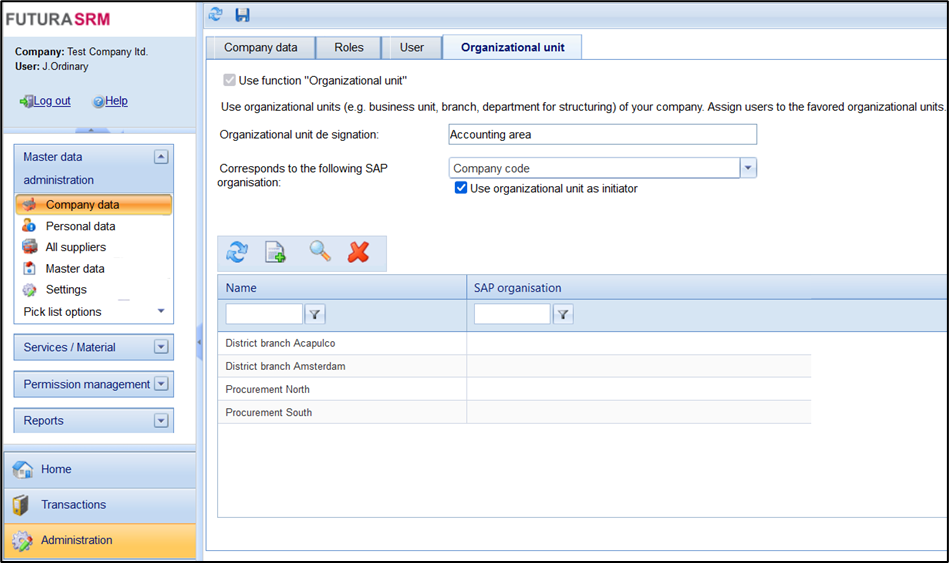In the Menu Administration > Company Data , the tab "Organizational Unit" is displayed: