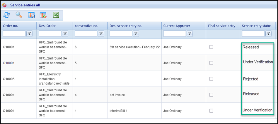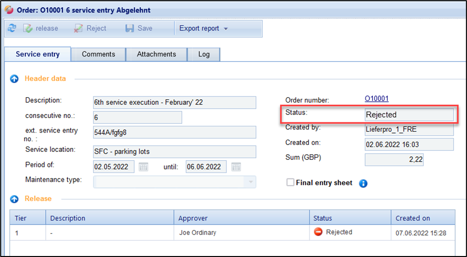 Declined | The service entry was rejected. In this case, the entry with the corrected quantities is returned to the supplier. The latter can revise the checked entry and resubmit it. |