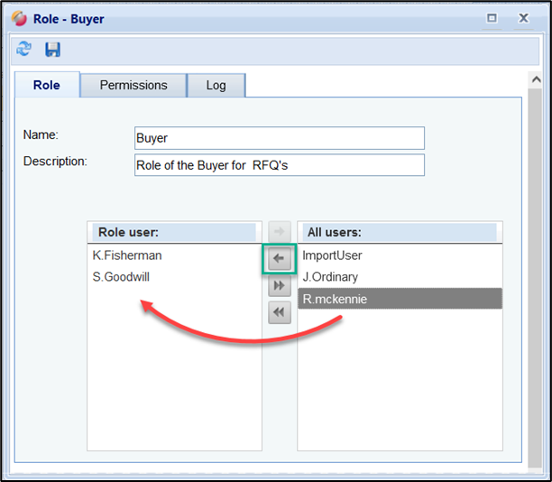 To remove a user from the role, select the user on the left and press the arrow button.