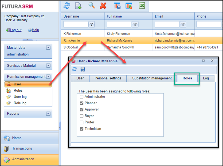 Alternatively, you can also assign roles directly in the user data window. To do this, go to the "Users" menu, double-click on the desired user and switch to the "Roles" tab. Here you can select the role(s) that are to be assigned to this user.