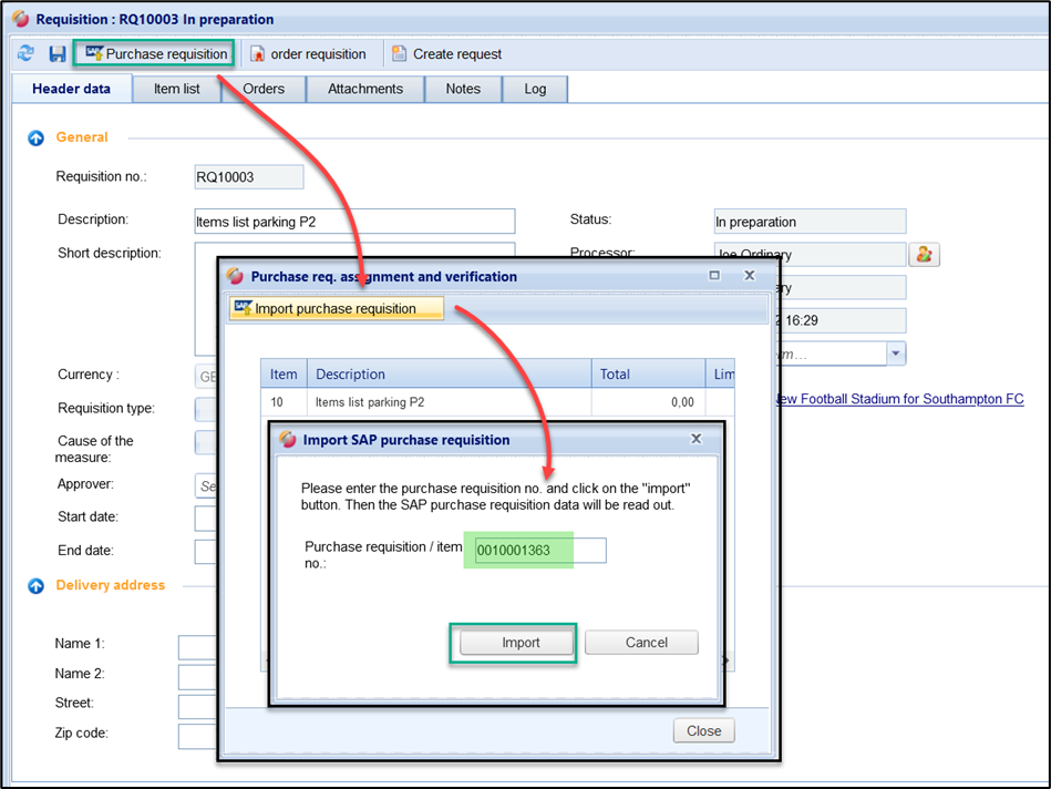 As long as the requisition is in the status "In Preparation", you can import another purchase requisition at any time using the same procedure or re-import and assign an already assigned purchase requisition (e.g., after a purchase requisition change in SAP).
