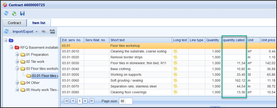 Open any Contract and switch to the Items list tab.