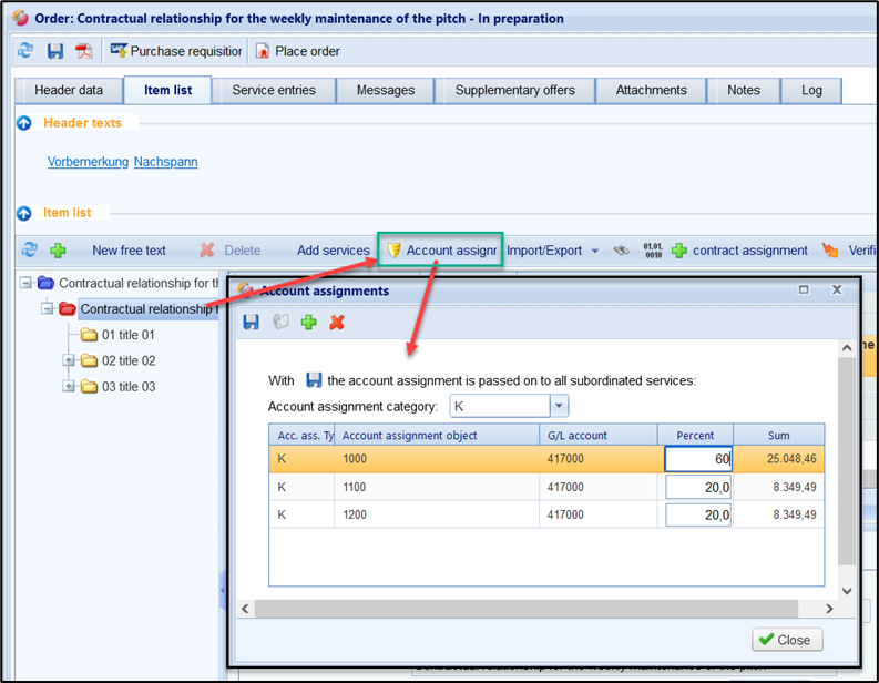 The account assignment is stored per service line. The assignment in the order item is only intended to adjust the account assignment for all service lines of the selected item on a flat-rate basis.
