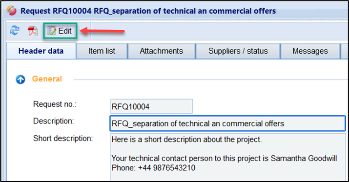 Change to the header data (short description, deadline, delivery dates, etc.)