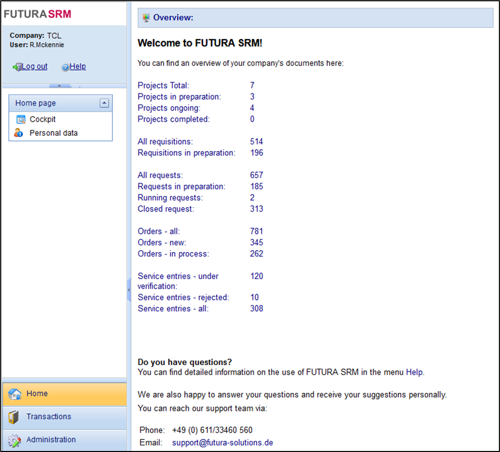 The total numbers displayed on the cockpit do not necessarily correspond to the number displayed in the respective table. Depending on the authorizations of your role, you may only see transactions in the table for which you are assigned either as a processor, contact person or as an approver for checking service entries. If necessary, your company purchaser also works with separate organizational units. In this case, you only have access to transactions whose affiliation corresponds to an organizational unit assigned to your access.