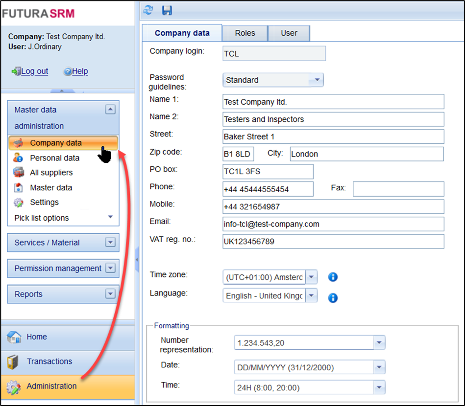 In the Company Data menu, you can maintain the contact details of your company. These are also displayed to the supplier and should therefore be filled in correctly. All mandatory fields are marked with a red asterisk if not filled.